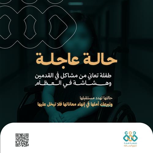 طفلة من ذوي الإعاقة تعاني من مشاكل صحية في القدمين وهشاشة في العظام بحاجة عاجلة إلى تقديم رعاية صحية وجلسات تأهيلية حتى تتحسن حالتها ساهم في تخفيف ألمها وتفريج كربتها وكربة أسرتها والله يحب المحسنين